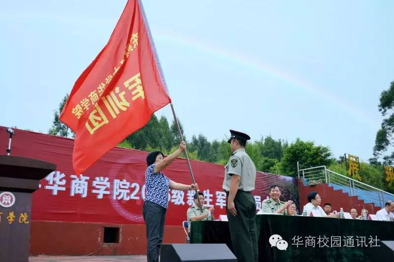 军训动员大会在庄严的国歌声中拉开帷幕。礼毕,支戈壁副院长将团旗授予军训团叶计选团长。