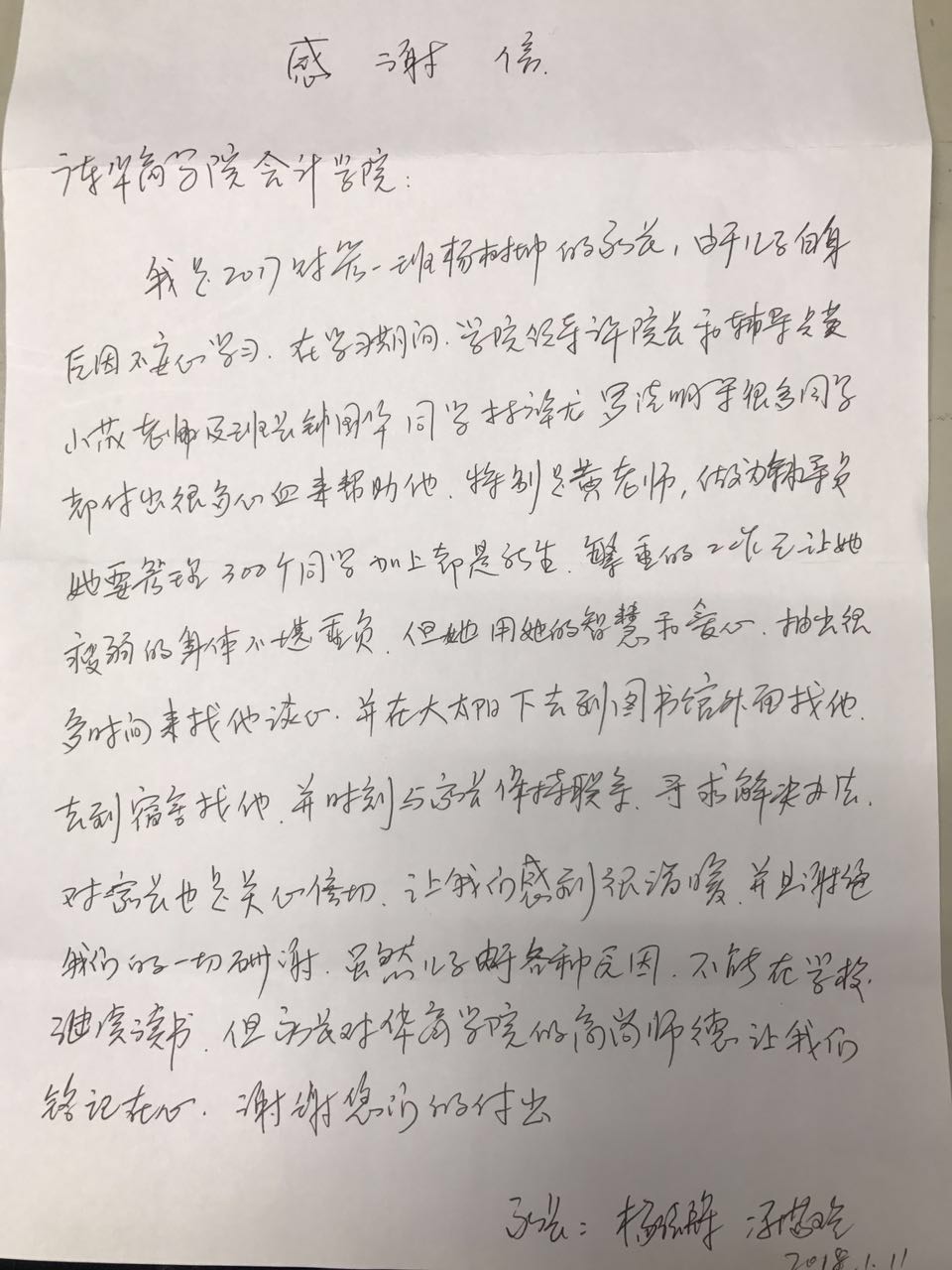 近日,会计学院收到2017级财管1班杨树坤家长的感谢信,家长在信中对辅导员黄小花老师对杨树坤入学以来的悉心帮助和照顾表示万分感谢。家长的认同就是对我们学工队伍的最大肯定,各辅导员应向黄小花老师学习,继续发扬为学生服务理念,继续做好本职工作。