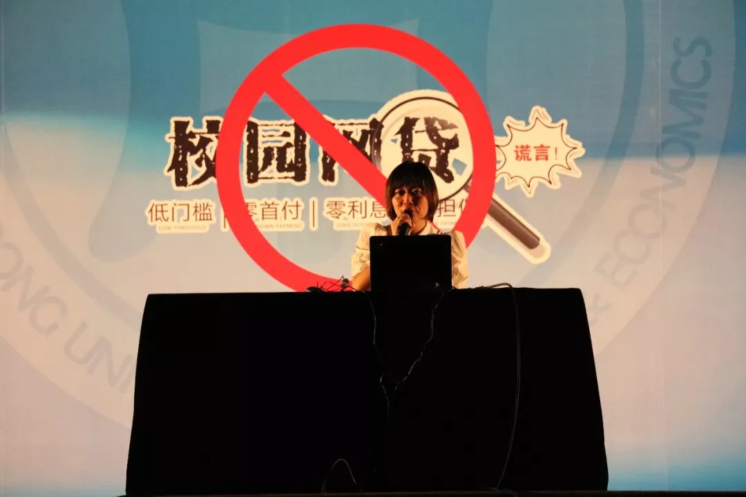 首先,吴洋行长从一个典型的案例讲起,使学生能更好了解校园贷是什么,她解释道:校园贷是专门针对大学生的一项金融借贷服务,在校大学生通过互联网在校园贷平台完成提交个人身份资料、审核、支付一定手续费等借款流程操作,就可以申请到一定额度的信用借款,用于消费、微创业、应急周转、培训助学等用途。校园贷一般出现在电商平台、校园网贷中介机构、线下校园贷机构、P2P及其他互联网金融平台。