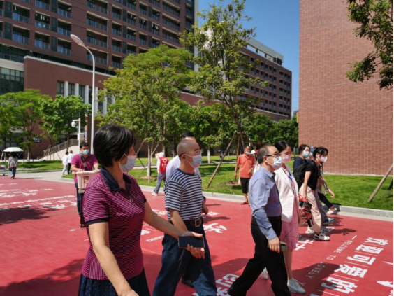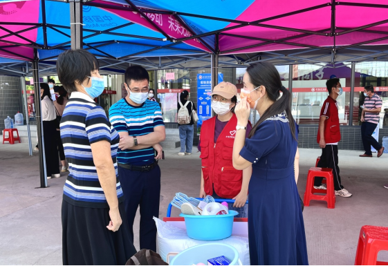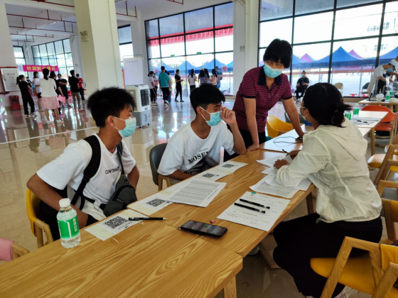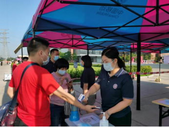 在校门口外,志愿者们积极引导新生及家长按防疫要求出示健康码、行程卡、测体温,确保新同学们的安全健康;