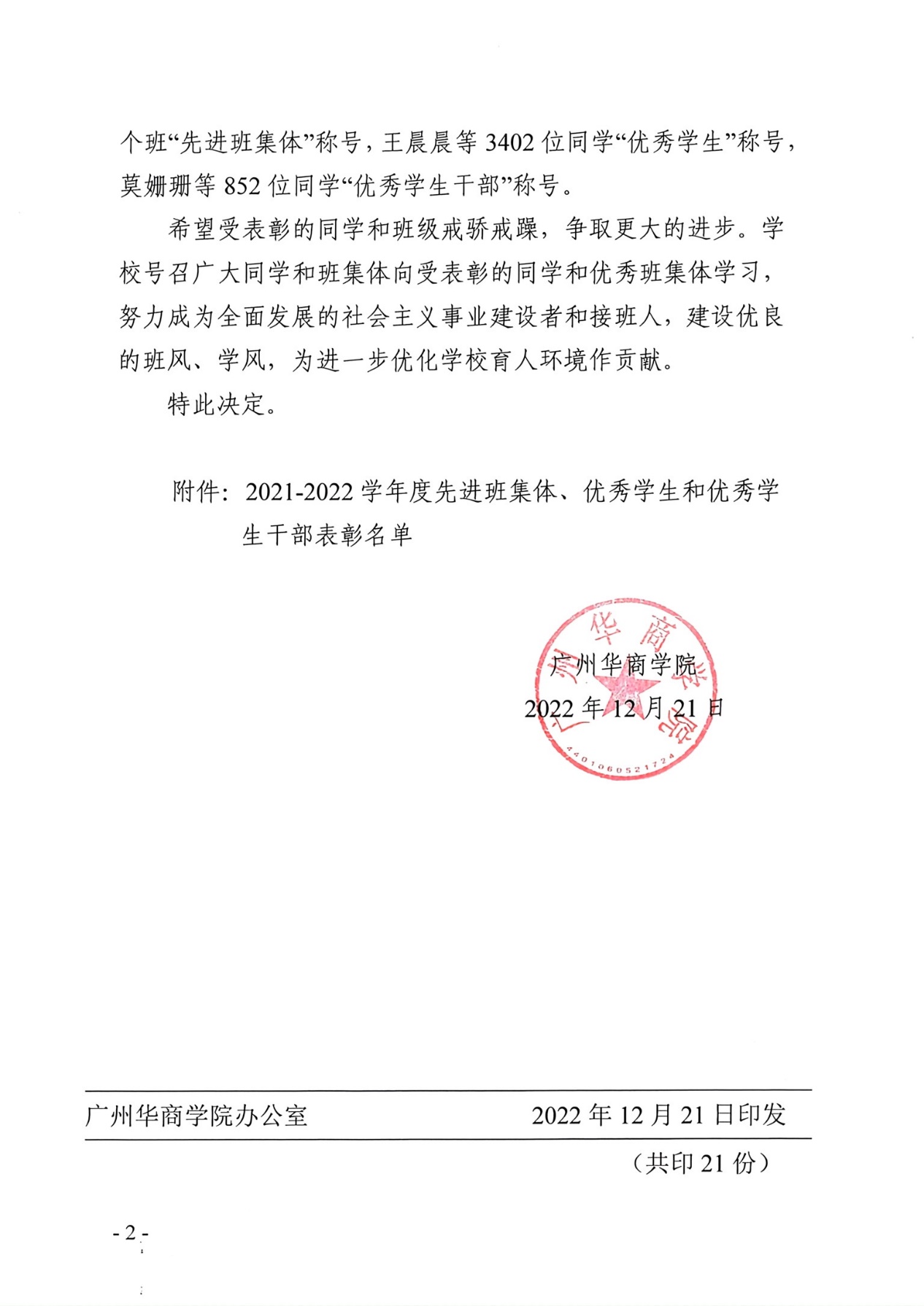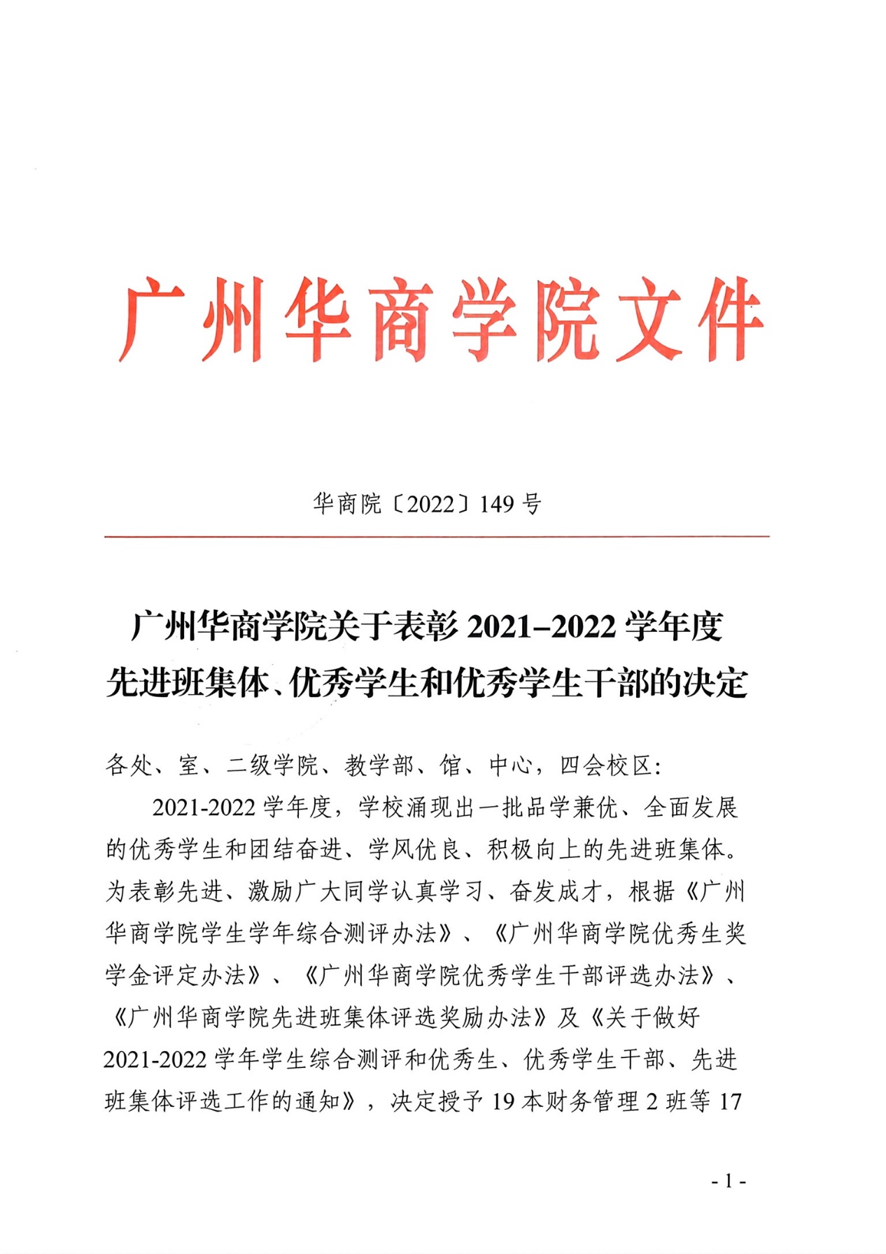广州华商学院关于表彰2021-2022学年度先进班集体、优秀学生和优秀学生干部的决定