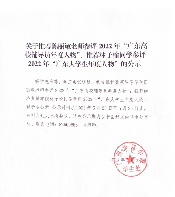关于推荐陈丽敏老师参评2022年“广东高校辅导员年度人物”、推荐林子榆同学参评2022年“广东大学生年度人物”的公示