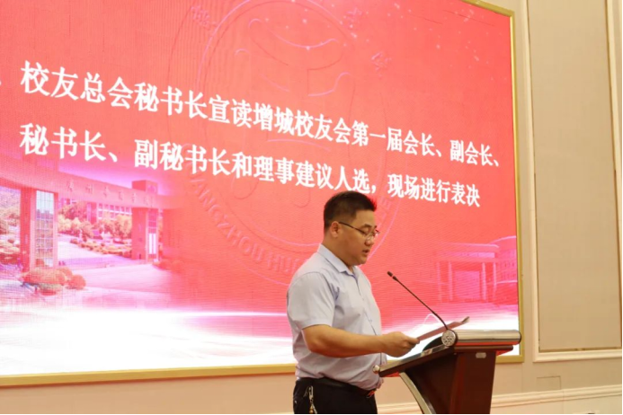 校友总会秘书长黄国富宣读了增城校友会第一届理事建议人选,并经大会表决一致通过名单草案。侯意雄任增城校友会会长,区晓莹、陈日班、胡世柯、李旭伟担任副会长,以及其他秘书长、副秘书长、常务理事、理事等共计39名校友成为第一届理事会成员。