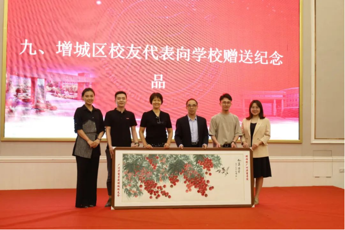 华商增城校友会第一届会长侯意雄发言,并代表增城校友会向母校赠送《红荔满堂》书画作品,寓意母校“厚德载物、硕果满堂”。