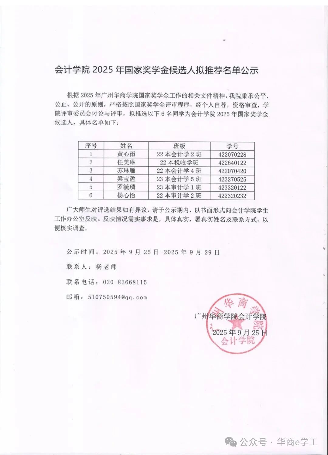会计学院2025年国家奖学金候选人拟推荐名单公示