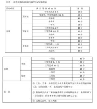 ②参加各院系、学校组织的各类征文比赛、辩论赛、演讲比赛、知识竞赛、创新创业竞赛、挑战杯(大学生创业计划竞赛)等提升学生综合素质的比赛,每人每次每项加2分,获各院系一、二、三等奖者分别加 3分、2 分、1分其他名次及优秀奖加1分;获校或厅级一、二、三等奖者分别加5分、4分、3分其他名次及优秀奖加2分;获省级一、二、三等奖分别加7分、6 分、5分其他名次及优秀奖加3分;获省级以上一、二、三等奖分别加10分、9分、8分其他名次及优秀奖加6分。
