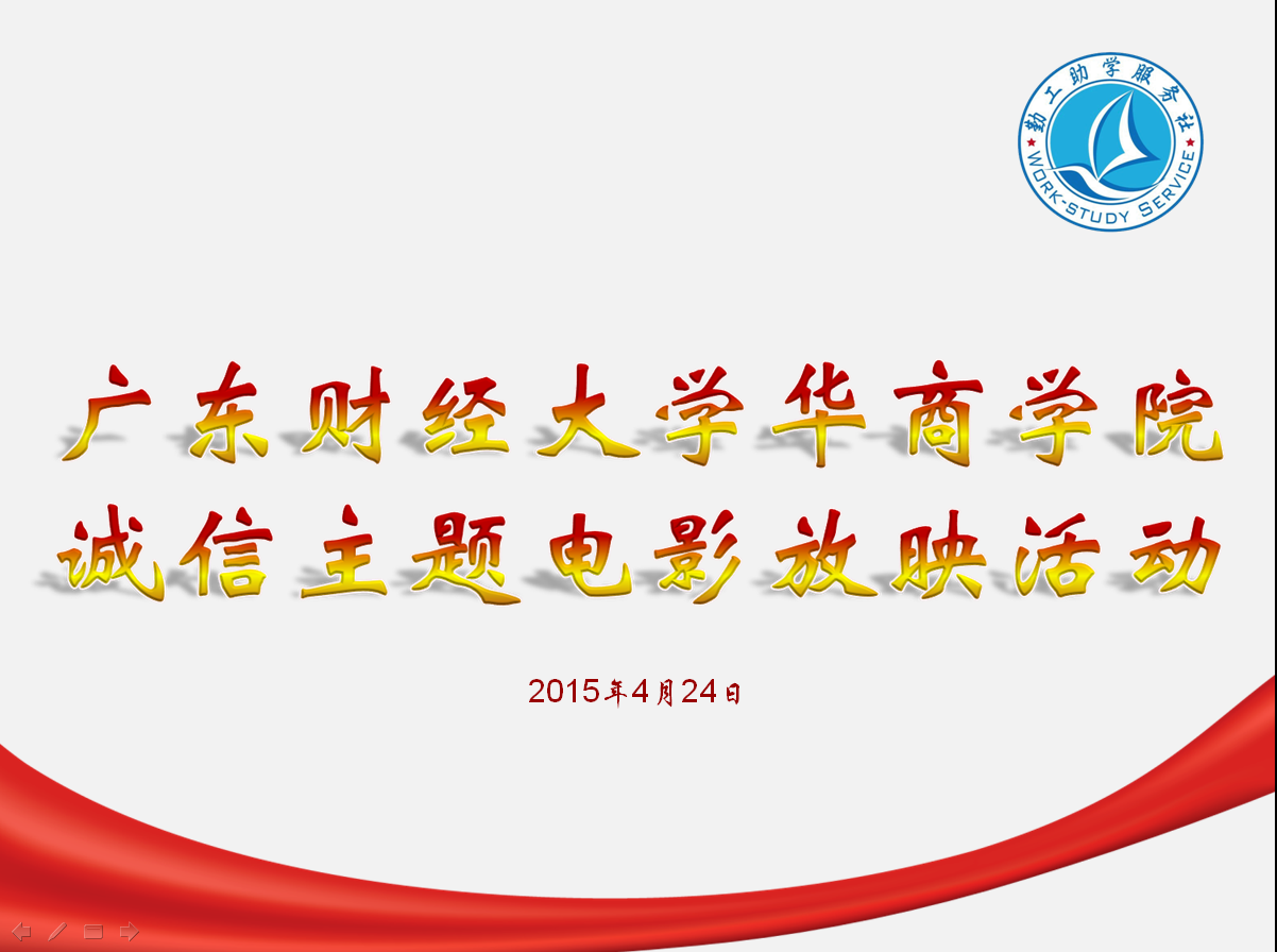 时间:2015年4月24日晚上7点进场地点:励志楼A108参与人员:全院各系获国家资助学生及申请国家助学贷款学生内容:晚上19:00-19:30播放片头微电影《欠条》、《作弊宝典》 19:30播放诚信电影《10个约定》