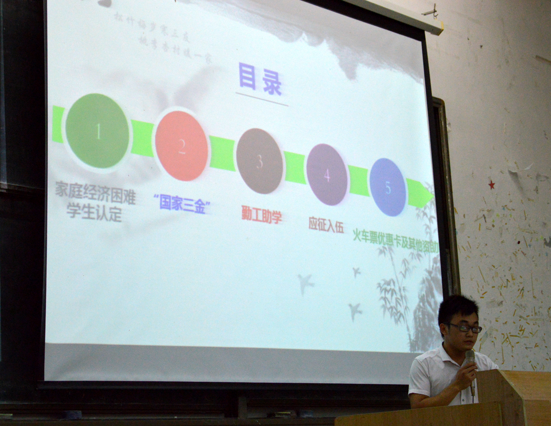 会议开始,学生处助学管理科罗宋老师首先介绍了助学管理科的六大方面的职务,包括国家助学贷款的办理、“国家三金”(国家奖学金、国家励志奖学金、国家助学金)的办理、大学生应征参军入伍资讯的宣传讲解、火车优惠票的办理、全院勤工助学岗位的安排、学院提供给困难学生的生活补贴。助学管理科科室虽小,却承担着重要的职责,多年来一直不断地为全院家庭经济困难学生普及各类国家优惠补助政策,讲解办理流程,同时为了更好服务我院家庭经济困难学生特组建学院勤工助学服务社、学院国家助学贷款学生助理等学生社团,积极开展各项宣传“奖、助、贷、补、勤”相关的活动,让华商学院更多的学生关注到“助学、圆梦、成才”这个重要的话题。