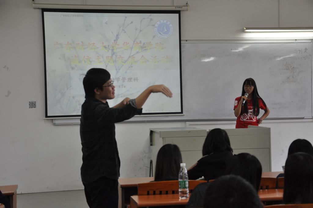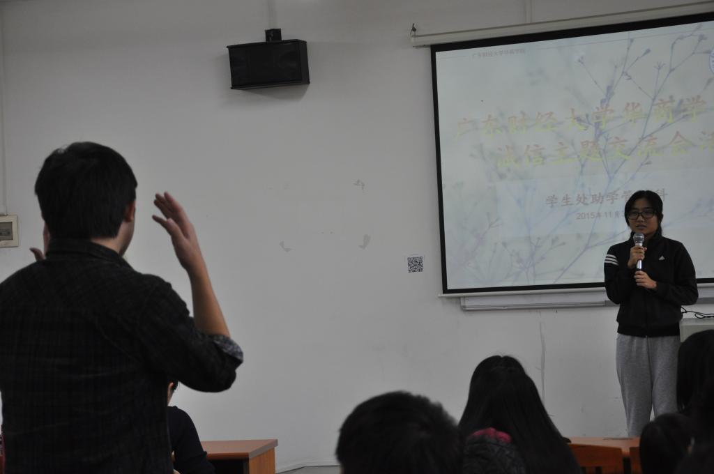 2015年11月3日下午3点,由院学生处助学管理科主办、院学生会勤工助学服务社协办和各系贷款学生助理参与的广东财经大学华商学院诚信主题交流会在厚德楼c402召开。学生处助学管理罗宋老师出席了本次会议。