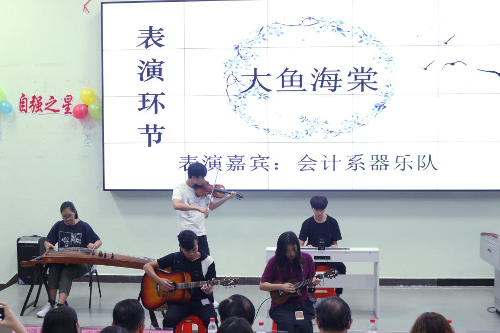 决赛首先进行的是选手演讲环节,十位选手依次上台,通过PPT展示的方式从学习、工作、生活等方面来叙述自己的自强故事。“天行健,君子以自强不息”,在经历了人生中的种种磨难后,他们身上无不散发着自强不息的光芒。面对评委老师的提问,选手们也都能从容不迫,用最自信的姿态作答。另外,我们有幸请来了会计系器乐队为决赛中场表演,一首感染力极强的《大鱼海棠》使得现场观众为之陶醉,久久回味。