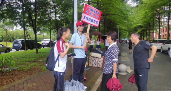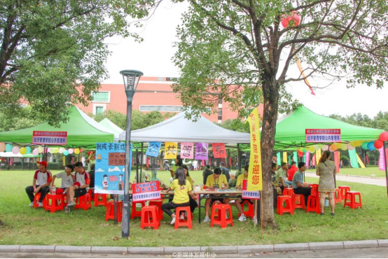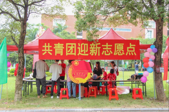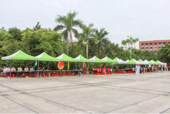 华商学院图书馆广场前设立了各系的迎新摊位以及共青团迎新志愿点,由各系的师兄师姐指引学生到图书馆内报到。
