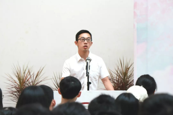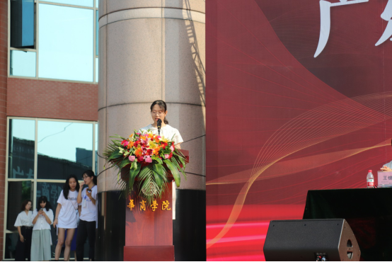大会第六项,是文学院外语系英语专业陈敏同学发言。陈敏同学作为大四师姐,为新生讲解自己过去三年的心路历程。她认为,学生应该孜孜以求,好学不倦,把握好大学生活的每一分每一秒,不虚度,不挥霍,虚心求学,广交益友,树立一个坚定的目标,并付诸于实践,闯出一片属于自己的天地。