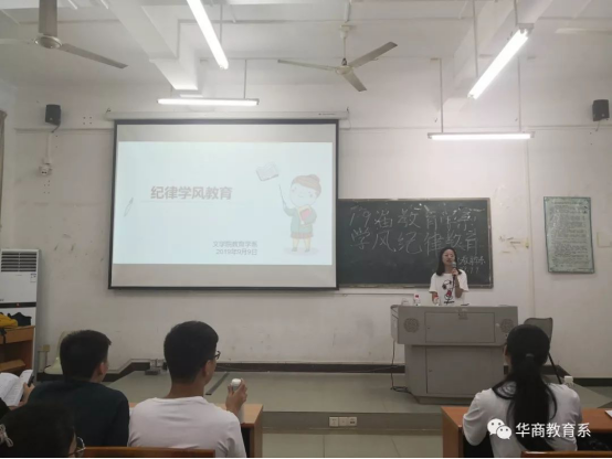 2019年9月9日下午16点整教育学系在励志楼B204顺利举办了19级新生学风纪律教育的课程。从“安全教育、奖助学金评定、考勤纪律、学习”这四个方面进行全面讲解,遵一方学风纪律,展学校面貌。