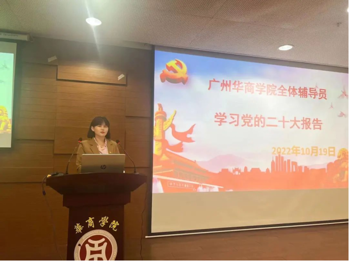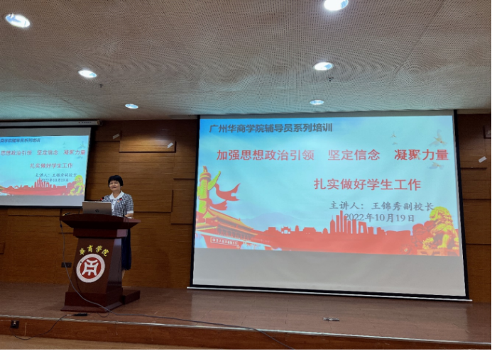 为深入学习贯彻党的二十大报告精神,高举中国特色社会主义伟大旗帜,不断加强辅导员政治理论水平,我校于10月19日在图书馆报告厅召开广州华商学院全体辅导员学习培训会。本次学习培训会邀请到我校党委副书记、副校长王锦秀作《加强思想政治引领,坚定信念,凝聚力量,扎实做好学生工作》主题报告,学生处许娜处长、黄国富副处长、二级学院学工主任及全体辅导员参加本次学习培训会,会议由许娜处长主持。