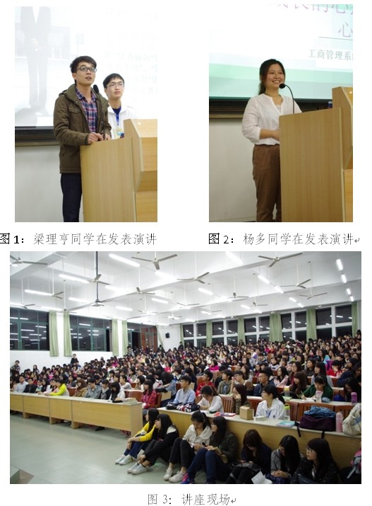 在此讲座中,梁理亨同学向全体同学分享了他大学一年半以来的学习生活心得以及暑假时到粤西支教的感人经历。他用朴素无华的语言为大家分析的大学的三个“mang”:茫、盲、忙,同时为如何能够解决这三个“mang”提出自己的建议。此外,他耐心地解答同学们关于如何协调好学习与工作等问题。演讲的最后,他指出:“生活就像海洋,只有意志坚强的人才能到达彼岸”,以此鼓励同学们在生活中要做个意志坚强的人,他的点睛之句也将场面引向了高潮,赢得了台下的热烈掌声。杨多同学则以“成长的心态,心态的成长”为主题,讲述了自己在大二那年的不幸经历,她在家庭条件及其恶劣的情况下坚定地担负起家庭重担,这份坚强与孝顺感动了在场的人;在学习工作方面,她指出,每个人都要做好本分,充实自我。对于同学们提出的大学期间考证问题,她都一一进行了详细耐心的解答。