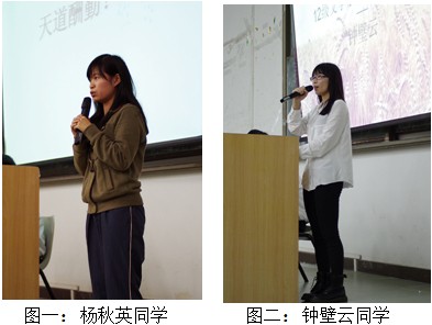 讲座上,杨秋英同学分享了自己学中文和读书的历程,讲述靠自己双手赚取生活费的经历。她说,虽然高考成绩不理想,但她会靠自己创造自己的未来。这也是给同学们的共勉。她特别强调图书馆在大学生活里的作用,鼓励同学们多利用图书馆,用书籍武装自己。而钟璧云同学的故事却格外悲伤,她的讲述让在场的同学们都为之动容。在演讲中她回忆自己苦涩的童年:父母的离异,妈妈的抛弃,奶奶的不理解。尽管现实存在许多不幸,尽管曾经反抗过放弃过,但最终她学会坚强。她在大学勇敢地接受挑战,积极参加各种活动,锻炼自己。