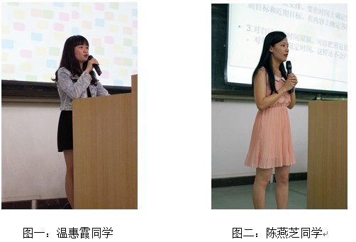 随后,陈燕芝同学则以“在学习中成长,在成长中学习”为主题,讲述了自己的学习和生活经历。她认为学习首先要奋勇前行,坚信天道酬勤,并在学习中明确目标,掌握方法;然后也要科学地安排自己的时间,一点点细化学习目标。她鼓励同学们要多参加课外活动,多参加社会实践,还建议同学们应及时对经验所得进行总结梳理。接着,她还分享了她的支教经历,支教的艰苦环境和简陋设备并没有使她退缩,她的乐观向上与积极进取令现场观众折服。最后她送给了在场同学“四颗心”,即:决心、恒心、信心、平常心,以此共勉。