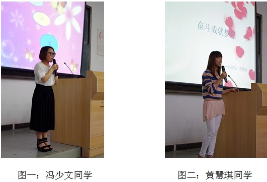 随后,黄慧琪同学则以“奋斗成就梦想”为主题,与我们分享了她的故事。黄慧琪同学首先以“你想从大学中获得什么?”的问题开场,接着讲述了她的读书经历,从小学开始便住校的她,身上透露出一种独立和坚强。