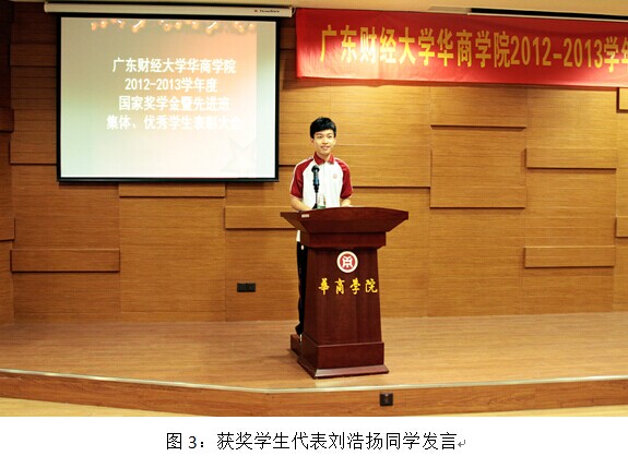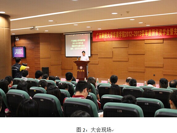 6月17日上午,广东财经大学华商学院2012—2013学年度国家奖学金暨先进班集体、优秀学生表彰大会在图书馆报告厅隆重举行。陈玉川院长、苏宁书记、支戈壁副院长、王中德副院长、教务处处长和学生处处长及各系主任、主管学生工作副主任,200余名获奖学生代表出席了大会。大会由邓基泽副院长主持。