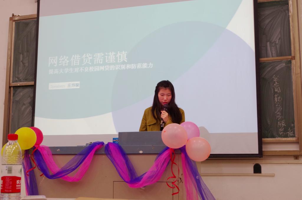 接着,庄炜璇同学以展示问卷调查、真实案例与视频的方式向我们讲述了常见的金融诈骗手段、网络借贷平台以及金融诈骗的相关法律知识。此外,她还着重讲述大学生如何对待和合理应对网络贷款的方法与技巧,并且多次警惕同学们:天上不会掉馅饼。