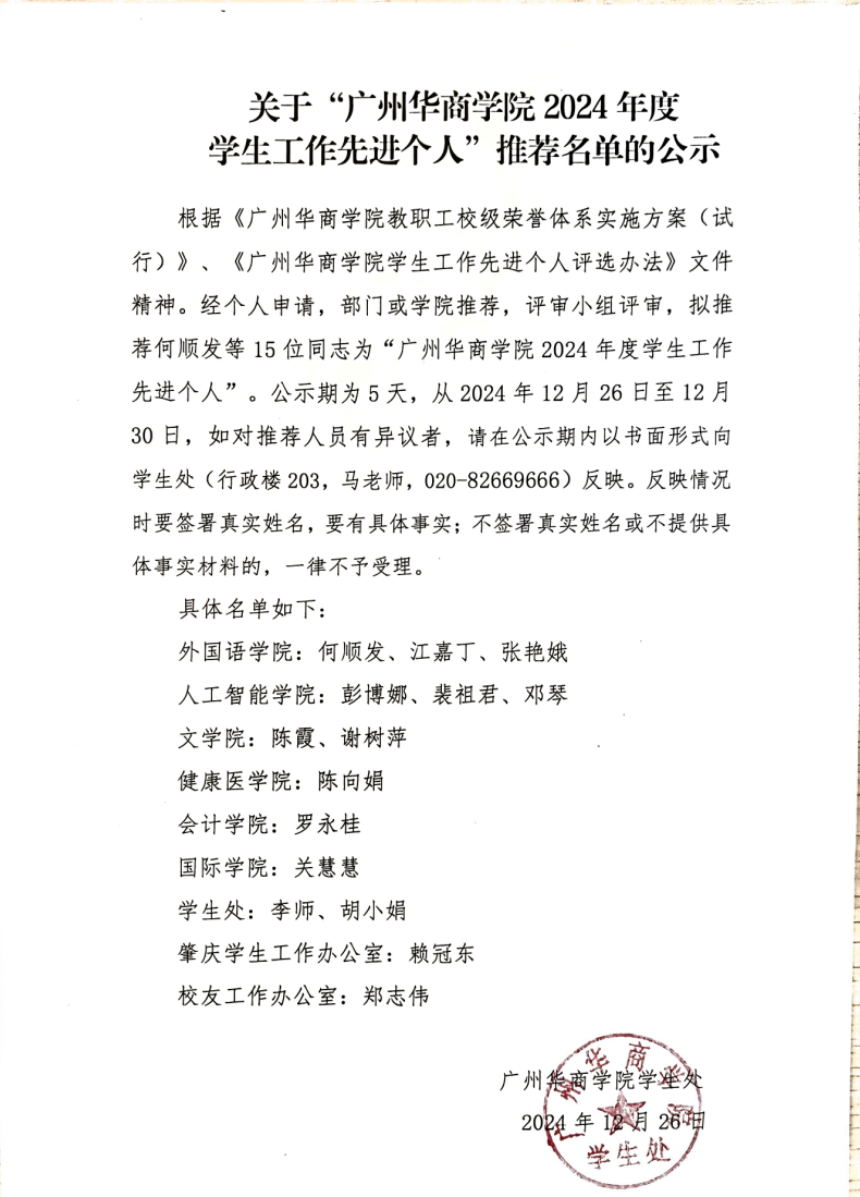关于“广州华商学院2024年度学生工作先进工作先进个人”推荐名单的公示