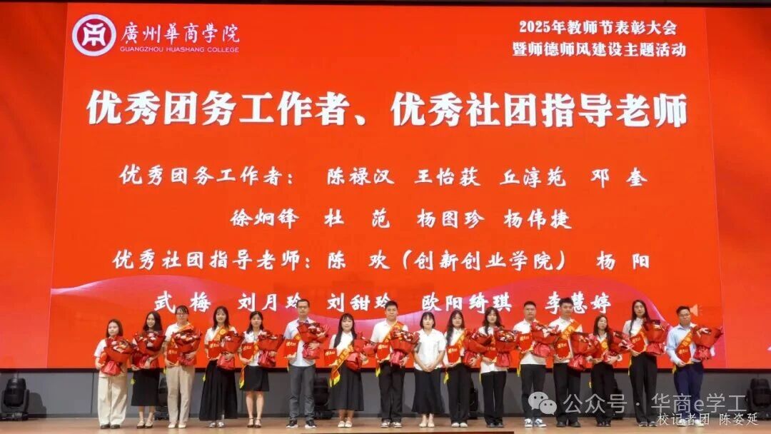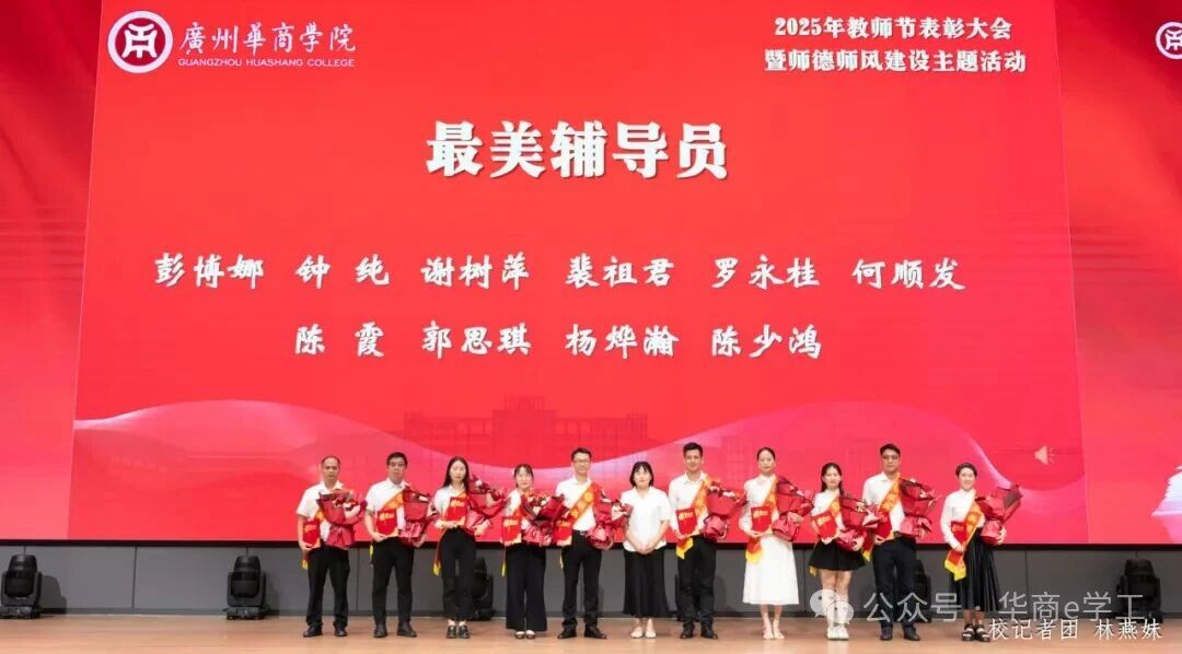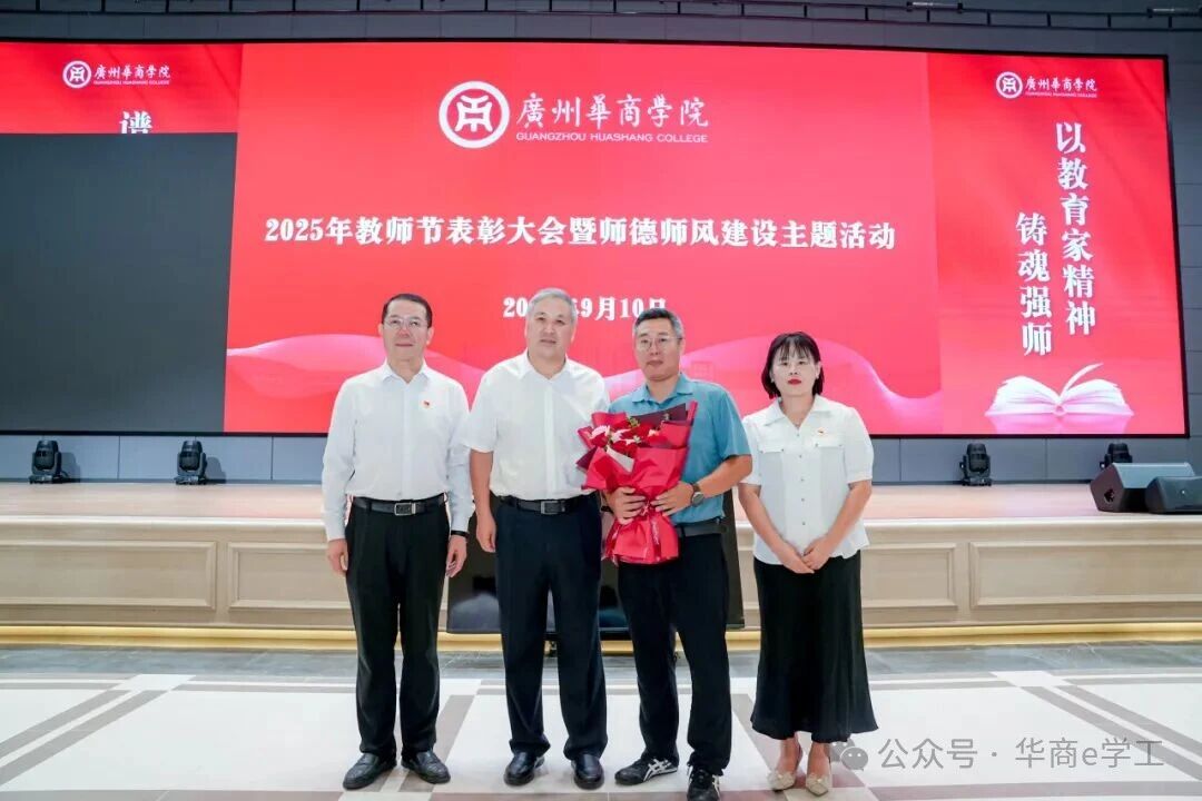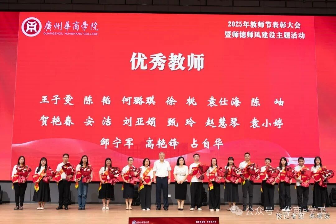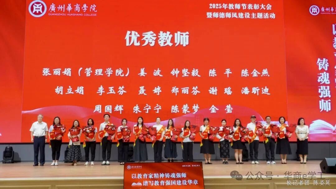 2025年9月10日下午,广州华商学院2025年教师节表彰大会暨师德师风建设主题活动在广州校区新国际会议中心大礼堂举行。本次活动以“以教育家精神铸魂强师,谱写教育强国建设华章”为主题,集团领导、学校领导、学校顾问,全体中层干部、受表彰教职工、教师代表及学生代表齐聚一堂,共同致敬教育工作者,共话学校教育事业发展新蓝图。大会由副校长范忠宝主持。