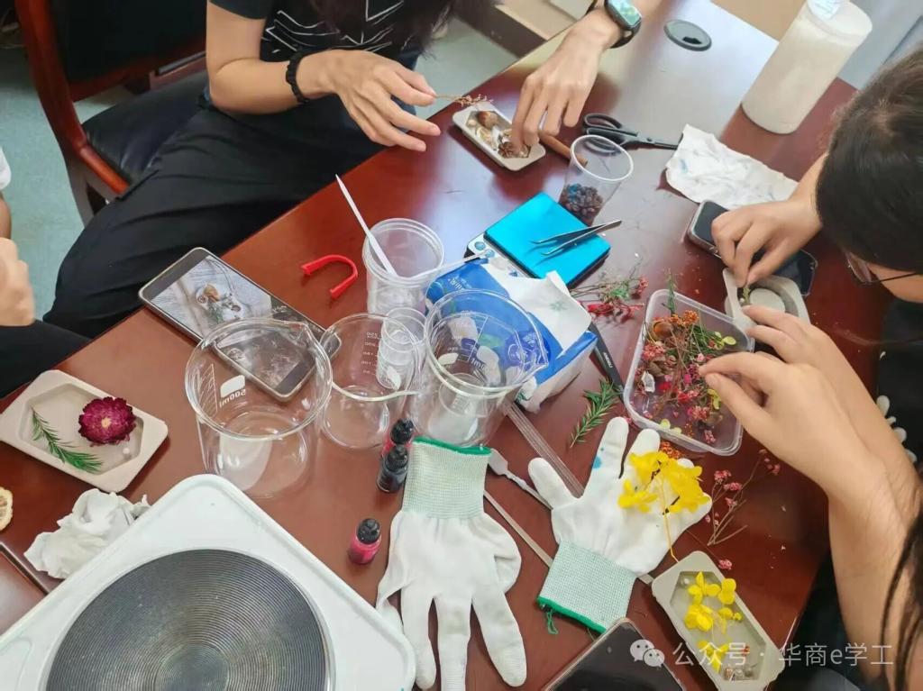 选好香型后,大家领取模具、彩色假花和其他装饰材料,开始动手制作。融化基蜡、调配精油、倒入模具、摆放装饰,每一个步骤都需要耐心与细心。空气中弥漫着各种精油的芳香,一个个精美独特的香薰挂牌在同学们的手中诞生。