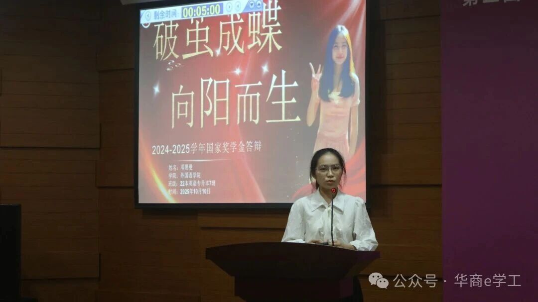 2025年10月10日下午,广州华商学院隆重举行2024-2025学年国家奖学金评审答辩会。本次答辩设图书馆报告厅与励志楼C407两个分会场,52名经层层选拔脱颖而出的优秀学子分为两组,通过精彩的演讲与答辩展开最终角逐。