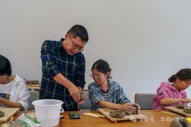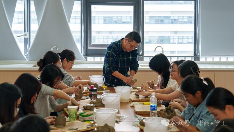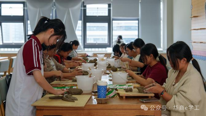 本次活动不仅是一次技艺传授,更是一场文化浸润, 借陶艺非遗技法,让校庆纪念品突破常规载体,通过校徽、校训元素的创意转化,强化身份认同,工艺大师与青年学子的协作,彰显华商“传承与创新”的永恒主题。“以土为纸,以指为笔,每一件作品都是华商人写给母校的三行情诗。”