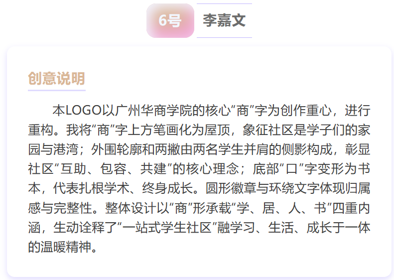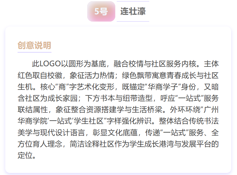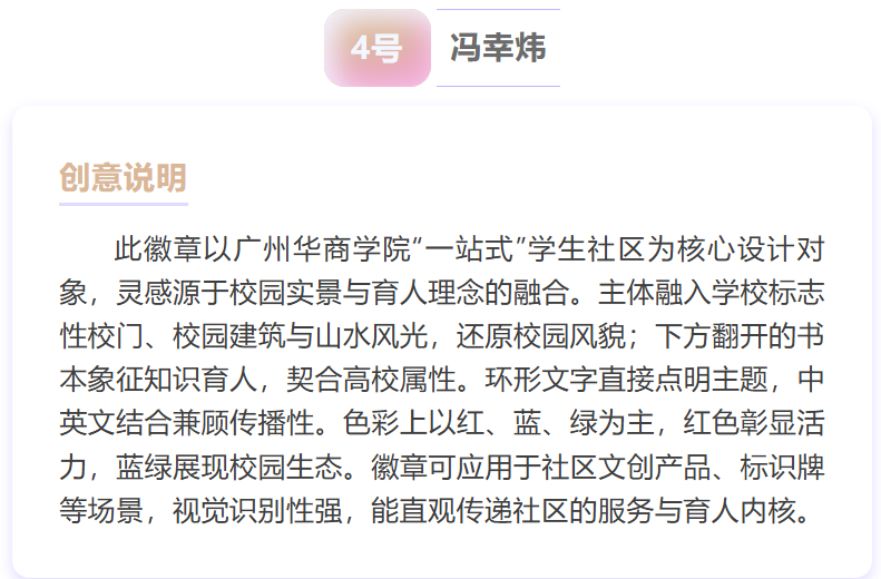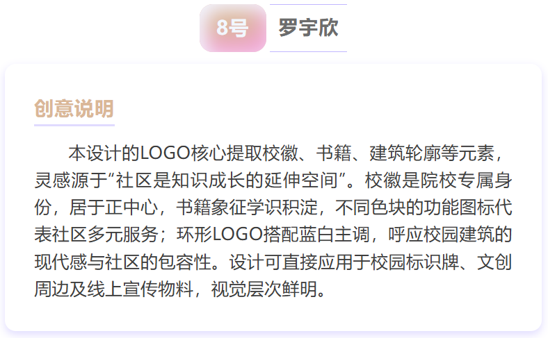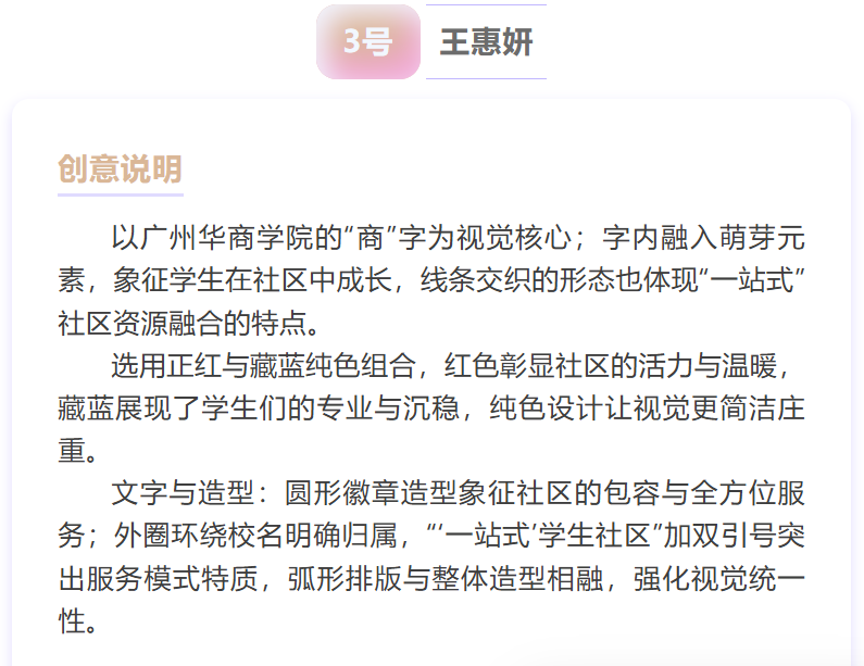 从校徽元素的巧妙融入到社区功能的生动诠释,从青春活力的色彩搭配到温暖治愈的设计理念,每一幅入围作品都承载着同学们对 “一站式” 学生社区的美好期许——它们或是将“共享空间”“成长驿站” 化作具象符号,或是用线条勾勒 “服务师生、共建家园” 的核心宗旨,每一处细节都藏着独特的巧思~