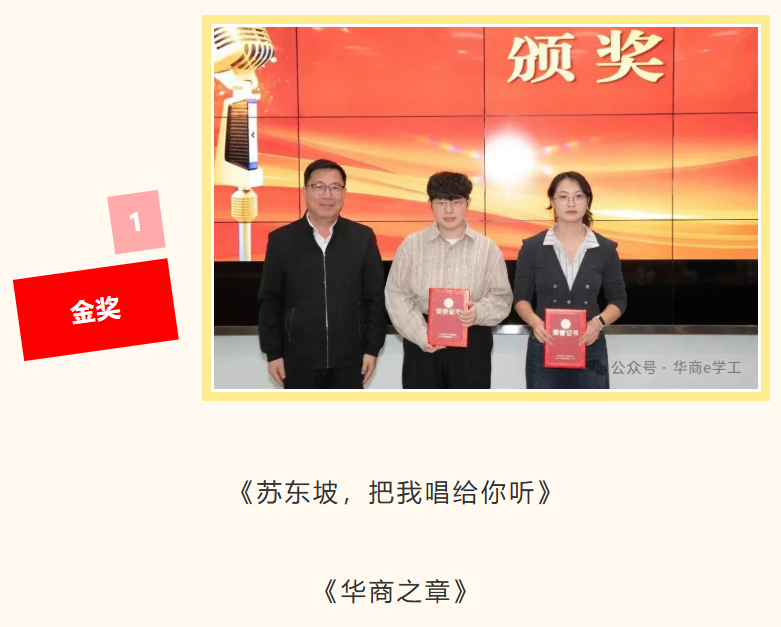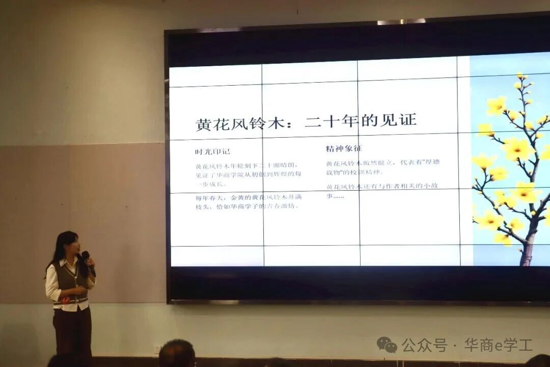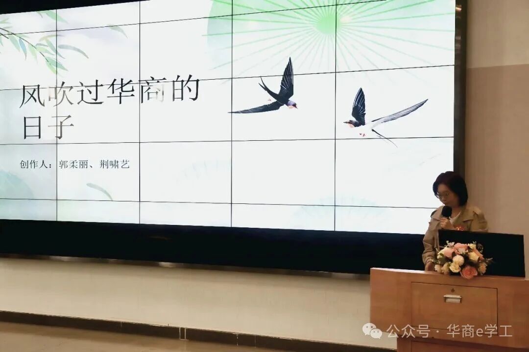 随后,大赛进入精彩的作品展示环节。12组参赛作品风格多元、内涵丰富,紧扣校庆主题与文化内核,充分展现了华商学院师生的创作才华与对母校的深厚情感。《廿载弦歌》以古典伴奏搭配轻快旋律,尽显校园文化底蕴;《廿载华光》凭借雅致古风歌词,诠释传统文化之美;《星芒向朝阳》旋律明快,传递积极向上的创作理念;两组《华商之光》各具特色,一组以快节奏引发情感共鸣,另一组用四字歌词搭配灵动旋律,韵味十足。此外,《风吹过华商的日子》轻快灵动,《行于华商》取材校园黄花风铃木,以舒缓旋律寄托校庆深情;《华商逐梦新程》抒情励志,歌词意象丰富,凸显华商核心价值;《华商,青春起航的地方》聚焦优良学风,传递青春正能量;《华商之章》以摇滚混搭轻快旋律,彰显学校独特风采;《苏东坡,把我唱给你听》从历史典故中汲取灵感,古风慢旋律尽显文化韵味;《爱聚华商》歌词贴合校园生活,兼具思想内涵与传唱度。每一位参赛者都详细介绍了作品的创作背景、缘由、历程及创新之处,并现场展播MV,赢得阵阵掌声。