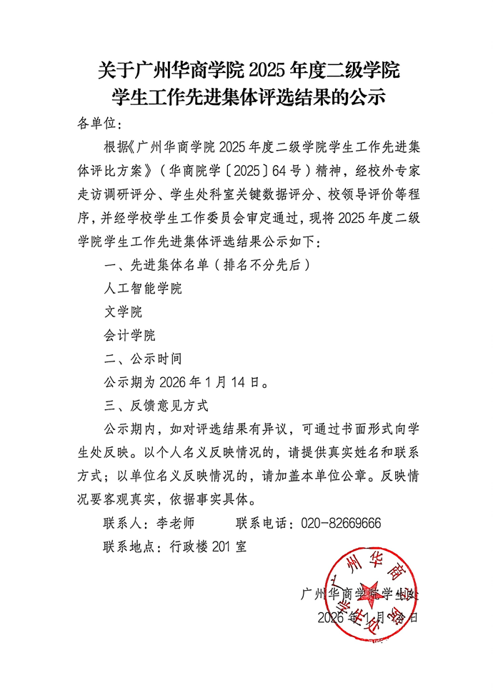 关于广州华商学院2025年度二级学院学生工作先进集体评选结果的公示