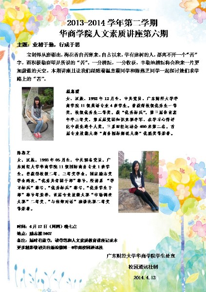 业精于勤,行成于思--华商学院第二学期人文素质讲座第六期即将举办