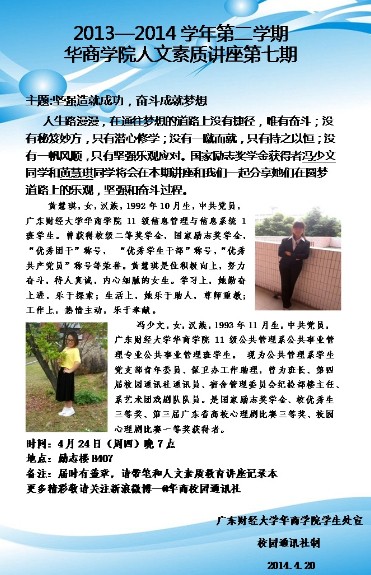 坚强造就成功,奋斗成就梦想--华商学院第二学期人文素质讲座第七期即将举办