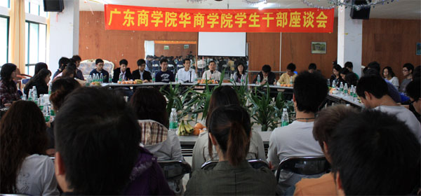 2009年2月18日晚,广东商学院华商学院举行了学院主管领导与全校各班班长的座谈会。党委黄虹书记、邓泽基副院长和团委邱会锋书记等领导出席了本次座谈会。为了与学生干部们交流平时学习、工作的的想法和遇到的问题,领导们敞开胸怀与班长们谈心。