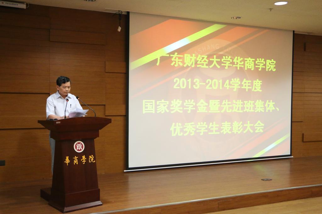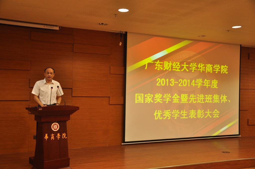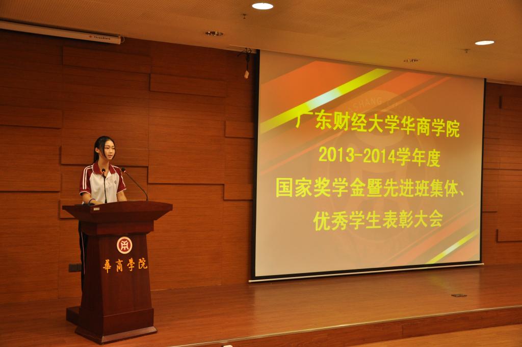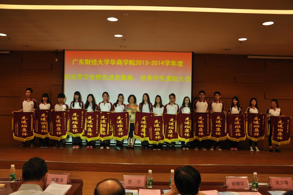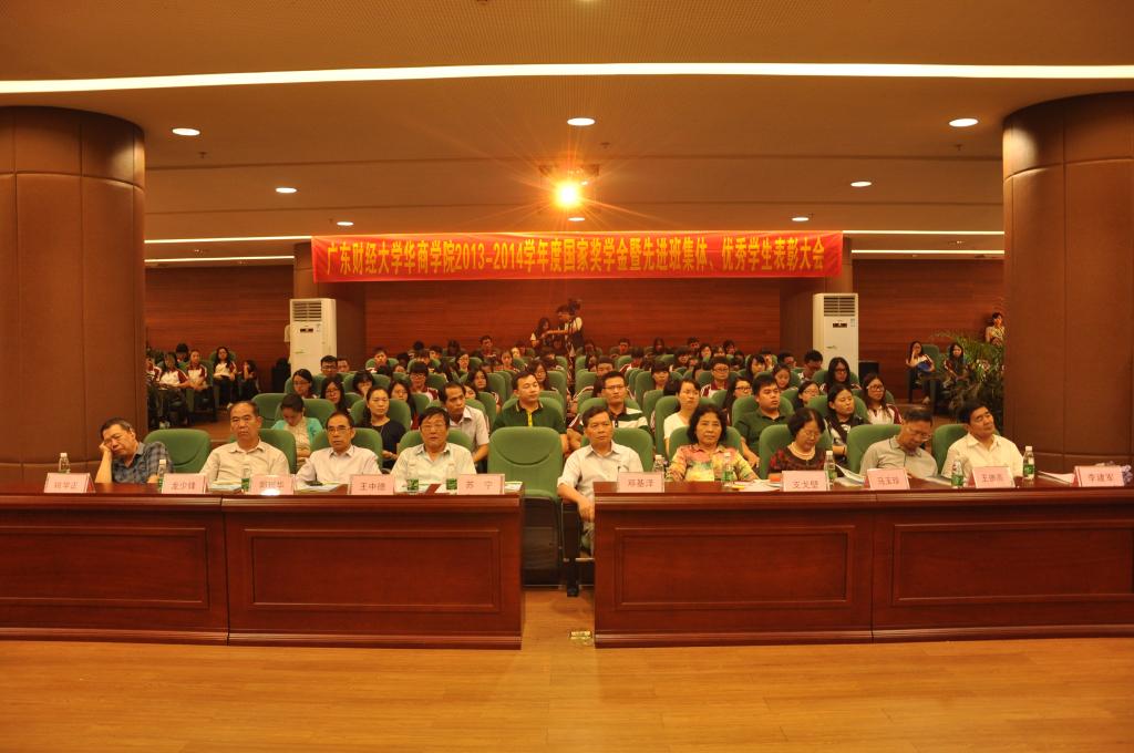 2015年6月16日下午,广东财经大学华商学院2013-2014学年度国家奖学金暨先进班集体、优秀学生表彰大会在图书馆报告厅举行。院党委书记苏宁、副院长邓基泽、支戈壁、王中德、郭银华、马玉珍、龙少锋及相关处室负责人、二级学院/各系负责人和200余名获奖学生代表出席了大会。大会由学生处刘德平处长主持。
