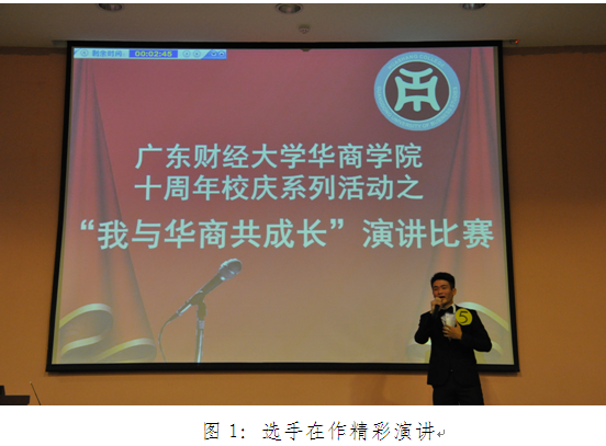 12月15日下午,国际会议中心四楼报告厅内座无虚席,由广东财经大学华商学院学生处和校庆办联合举办的十周年校庆系列活动之“我与华商共成长”演讲比赛在此隆重举行。来自各二级学院、系部的8位选手参加了比赛。学院王锦秀副院长、学生处刘德平处长,学学生处黄国富副处长,学院办公室吕书勉副主任、各二级学院、系的学工负责人和学生组织代表担任此次比赛评委。