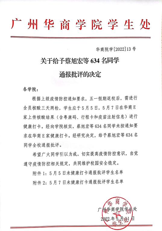 根据上级疫情防控通知要求,五一假期返校后,需进行全员核酸三天两检,学生应于5月5日,5月7日在华商E家上传核酸结果(含粤康码、行程卡和疫苗注射信息)进行健康打卡。经向学院核实,蔡旭宏等634名同学未按通知要求在华商E家健康打卡。经研究决定,给予蔡旭宏等634名同学全校通报批评。