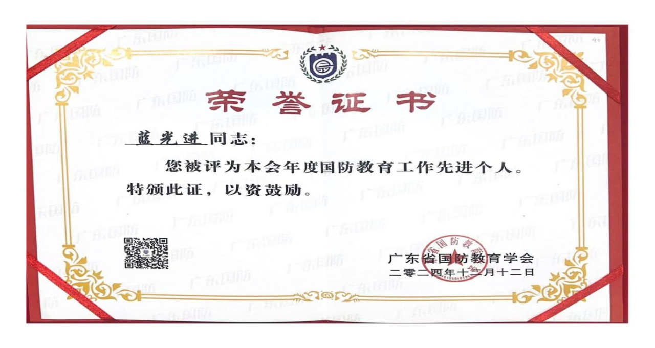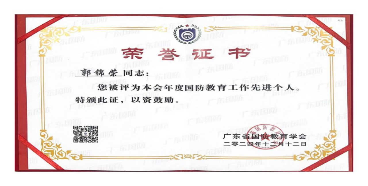 12月25-29日,广东省2024年度国防教育学会工作会议在中山市召开,王光军等相关领导出席本次会议。我校荣获2024年度国防教育工作先进单位,学校郭锦荣老师和蓝光进老师被评为年度国防教育工作先进个人,在大会上获以表彰。