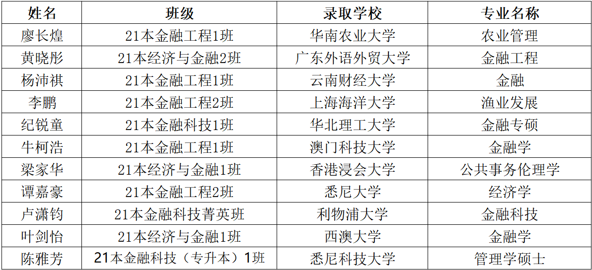 截至到目前,我院共有11名考研学子在2025年全国研究生招生考试中脱颖而出,以优异的成绩被华南农业大学、广东外语外贸大学、云南财经大学、上海海洋大学、华北理工大学、澳门科技大学、香港浸会大学、悉尼大学、利物浦大学、西澳大学、悉尼科技大学等国内外知名高校录取。