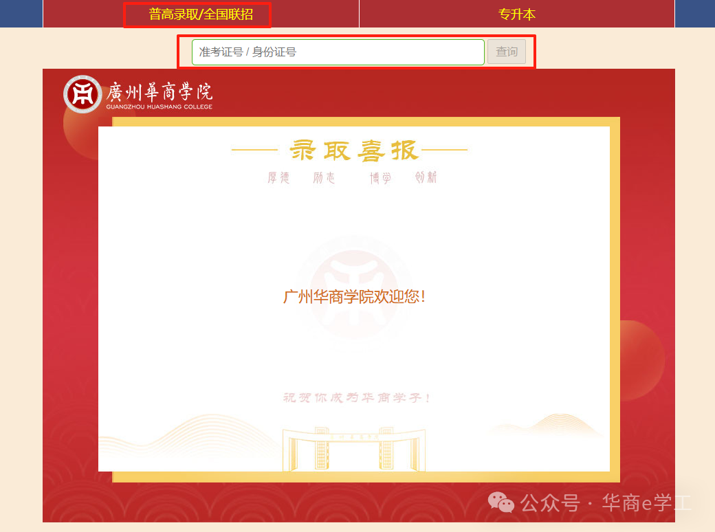 广州华商学院招生信息网(http://zs.gdhsc.edu.cn/),进入网站首页,点击【录取/成绩信息查询】;输入个人信息点击查询即可
