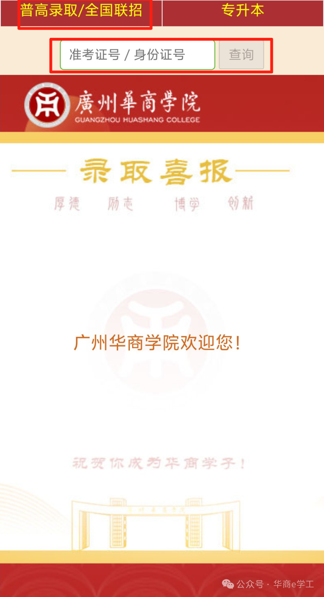 广州华商学院招生信息网(http://zs.gdhsc.edu.cn/)进入网站首页,点击【录取/成绩信息查询】;输入个人信息点击查询即可