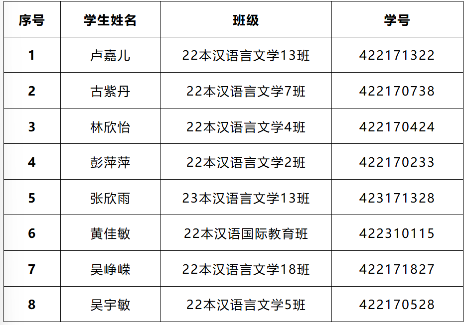 根据华商院学〔2025〕51号《关于做好2025年广州华商学院国家奖助学金工作的通知》要求。文学院本着“公平、公开、公正、择优”的原则,在广泛宣传基础上,经学生本人申请,班级评议、年级推荐,学院国家奖学金评定小组审核、评议,我院决定拟推荐卢嘉儿等8名同学参加学校国家奖学金评选,现给予公示。