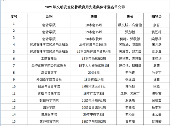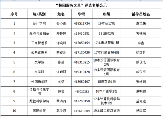 根据《华商学院关于四类学生结对帮扶的工作方案》、《关于评选2020年校园服务之星的通知》和《2021年文明安全纪律教育月评选活动的通知》文件精神和要求,在各二级学院、系评选和推荐的基础上,经过学生处复核,确定评优结果。现将20192020学年校园服务之星、2021年文明安全纪律教育月先进个人和集体评选名单公示进行公示,详情请查看附件。