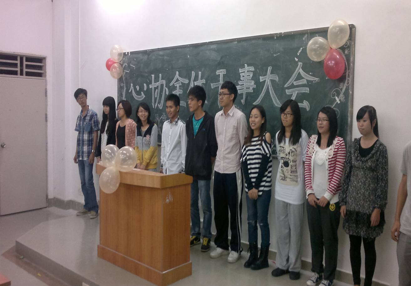 2012年10月30日晚上7点30分,心理健康协会于创新楼E403课室召开了12级心协干事动员大会,会议主持人是组织部的干事李蔚同学,出席大会的有院学生会社团联合会的干事。