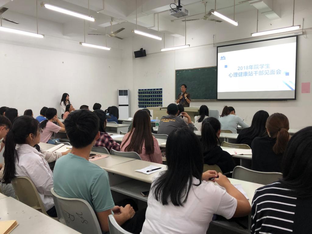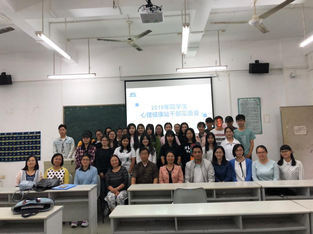 2018年10月30日下午,我院学生心理健康站站长见面会在励志楼B202顺利进行。本次大会请来了学生处副处长熊桂桃,学生处心康中心侯小花主任,王素芹老师,陈梅老师,李娇娇老师,二级心康分站指导老师朱穗云老师,梁利老师,梁思婷老师,许磊磊老师,李佳蔚老师,刘甜玲老师。本次会议由院学生心理健康总站站长刘欢欢主持。