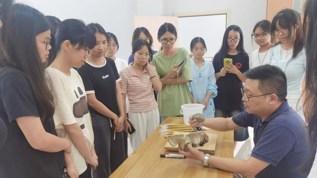 随后,郭步老师在同学们的片片掌声中围绕石湾公仔展开,从起源讲起,讲述其在岁月中沉淀的艺术风格,如造型如何兼顾写实与夸张 ;又延伸至陶艺知识,讲解泥料特性、烧制要点等内容,让同学们对陶艺从陌生到心生向往,沉浸式感受非遗陶艺的独特魅力。