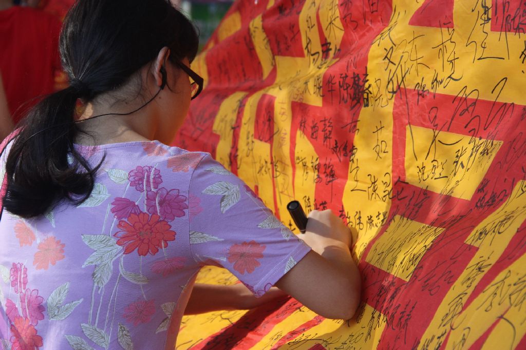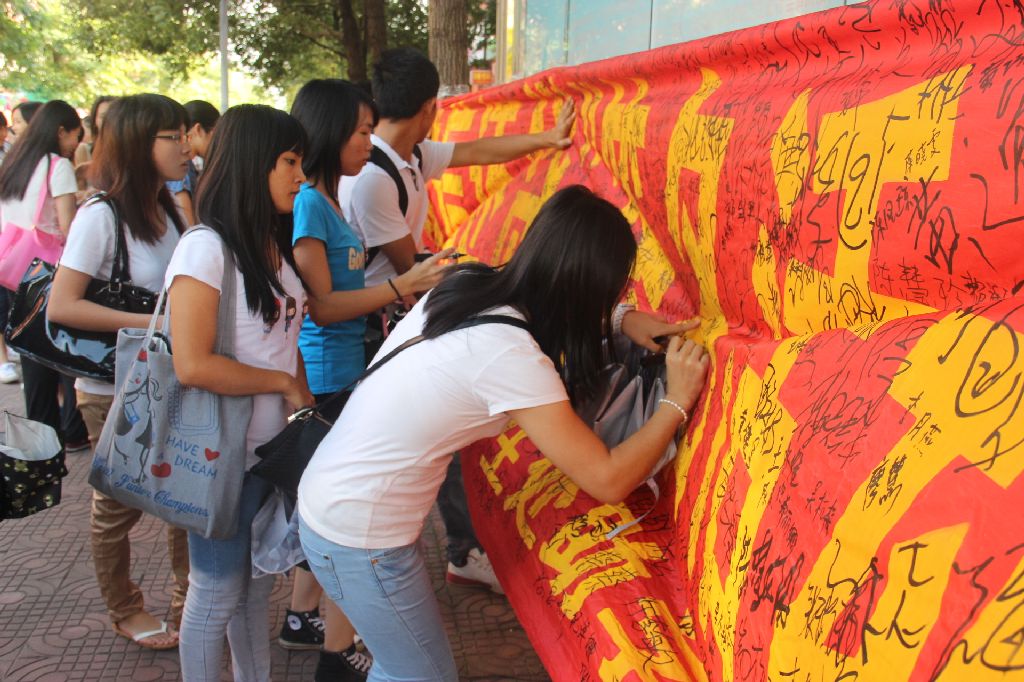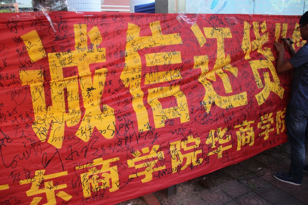 华商学院学生处助学管理科于2013年10月15日在明星餐厅校道旁举办了“感恩祖国,诚信还贷 ”横幅签名活动。此次活动得到我院广大获得国家资助学生的支持,此次签名活动目的重在让我院广大师生时刻不忘感恩祖国,特别是家庭经济困难学生。要时刻怀着一颗感恩的心,做一个讲诚信的人。
