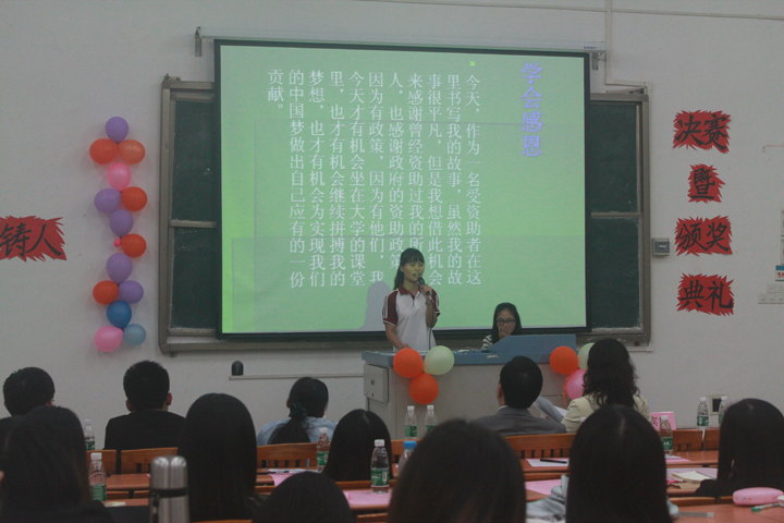 随后,比赛开始,12位参赛者各自为自己的作品演讲,诉说着他们求学之路的艰辛与坎坷,并为自己梦想努力奋斗的精神,感谢国家在他们需要之时帮助他们,鼓励他们坚持自己的梦想。同时我们也深刻感受到在国家政策帮助下,使得更多的莘莘学子实现他们的梦想。接着由欧阳庆华同学为大家演奏歌曲,在一首激励人心的歌曲之后,主持人宣布获奖名单,何慧娴同学作品获得本次比赛的一等奖,劳晓兰同学和韦宏明同学的作品获得本次比赛的二等奖,赵燕妮同学、方希和同学以及黄晓星同学作品获得本次比赛的三等奖。本次比赛共评出1个一等奖,2个二等奖,3个三等奖以及6个优秀作品。并由嘉宾为优秀奖获得者,三等奖获得者,二等奖获得者以及一等奖获得者颁发证书及奖品。颁奖仪式在观众的掌声中顺利结束。