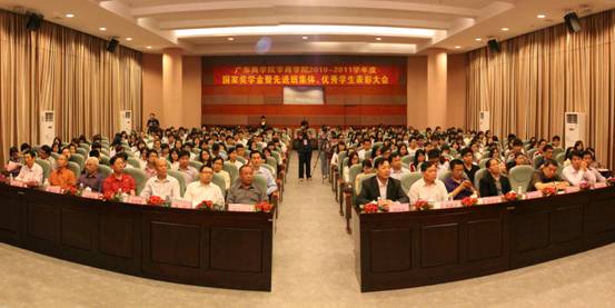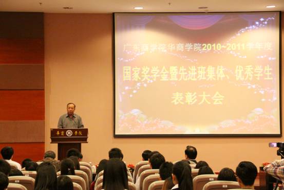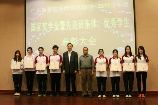 4月17日下午三点,广东商学院华商学院2010~2011学年度国家奖学金暨先进班集体、优秀学生表彰大会在会议中心四楼演讲厅隆重举行。广东省政协常委、广东商学院华商学院廖榕就董事长,广东商学院华商学院陈玉川院长,学院党委黄虹书记,学院邓基泽副院长,学院张方林副院长出席了本次表彰大会,学生处领导以及各院系主任、辅导员代表和受表彰学生参加了颁奖大会。大会由张方林副院长主持。